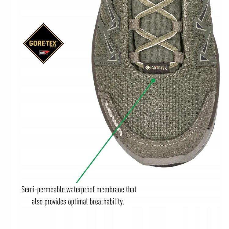 Wyściółka z membraną Gore-Tex zapewnia suchość i właściwy mikroklimat stopom gdy używamy Innoxów w wilgotnych warunkach.