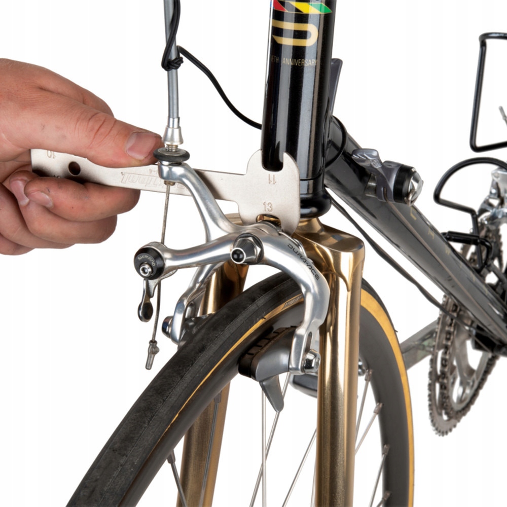 Cienki klucz z otworami 10, 11, 12 i 13 mm, dostosowany do wielu modeli hamulców szosowych w typie Single Pivot, oraz Dual Pivot.